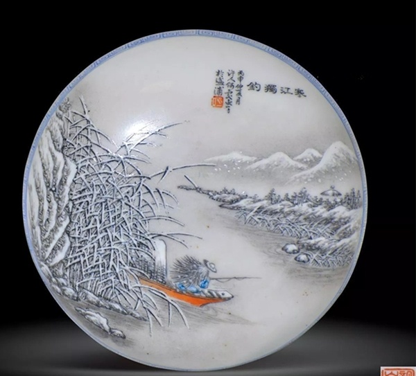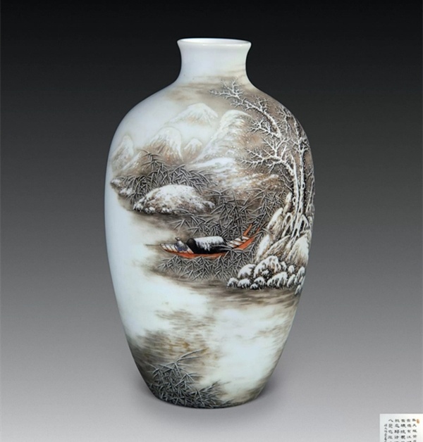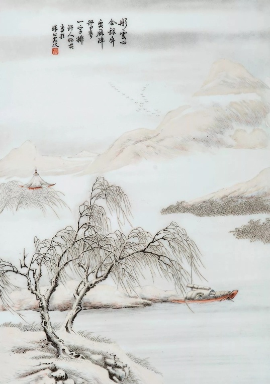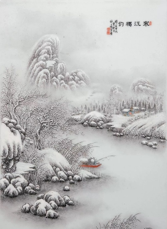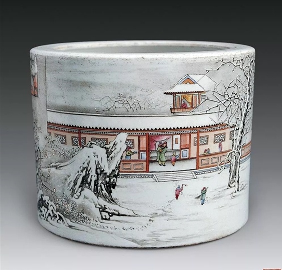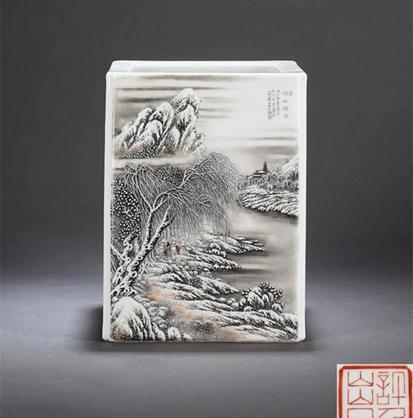 ②笔墨见“四王”笔意,苍润清逸,沉而不厚、秀而不媚,高洁旷远。同时,他巧妙地运用粉彩玻璃白的粉润特性,用敷粉留白表现雪色,避免了雪景色阶少的缺点,表现出画面的浓淡一体、过渡自如。③何许人先生的雪景瓷绘,最擅用艳黑之笔勾山画岭,再用赭石层层皴染出阴阳面的次第有序。