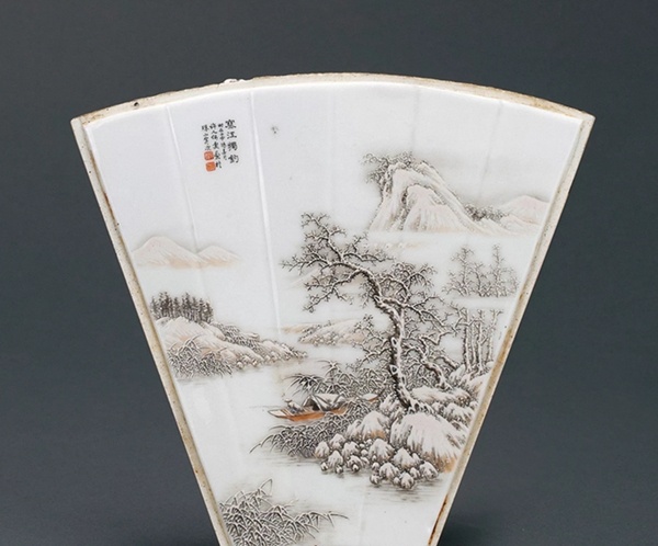 近代 粉彩雪景扇形瓷板, 拍卖成交价格估计:RMB 320,000-450,000,最终成交价格:RMB 552,000, 拍卖专场:中国嘉德国际拍卖有限公司 中国嘉德2017秋季拍卖会, 拍卖成交时间:2017-12-21, 尺寸:最宽20cm。