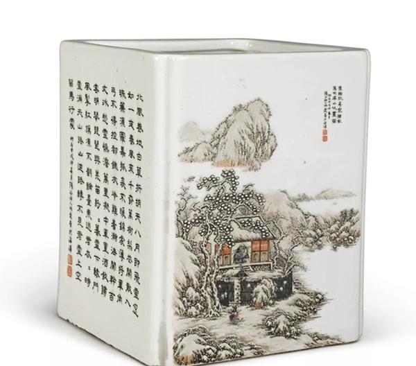 珠山八友何许人雪景图笔筒, 拍卖成交价格估计:RMB 25,000-45,000,最终成交价格:RMB 27,500, 拍卖专场:上海博海拍卖有限公司 2005秋季艺术品拍卖会, 拍卖成交时间:2005-12-25, 尺寸:高15cm。