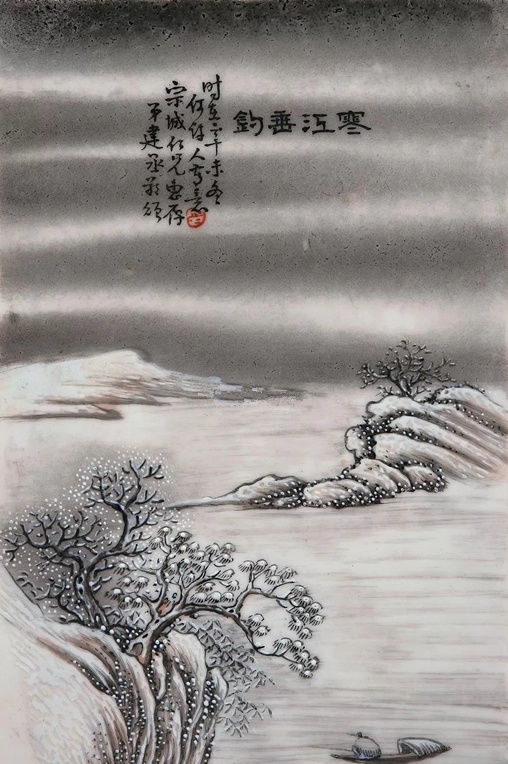 何许人 粉彩“寒江垂钓”瓷板, 拍卖成交价格估计:RMB 10,000-15,000,最终成交价格:RMB 13,800, 拍卖专场:上海崇源艺术品拍卖有限公司 2009年度景德镇国际艺术陶瓷拍卖会, 拍卖成交时间:2009-10-20, 尺寸:20×13cm。