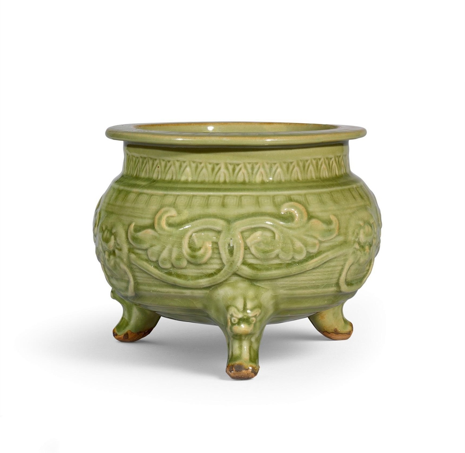3:金耀州青釉缠枝花三足香炉,尺寸:mouth D19.6厘米,估价:HKD 2,000,000 ~ 3,000,000,成交价: HKD 2,772,000 ,成交时间: 2021-04-22 ,拍卖公司:香港蘇富比拍卖有限公司,拍卖专场:2021年春季拍卖会。