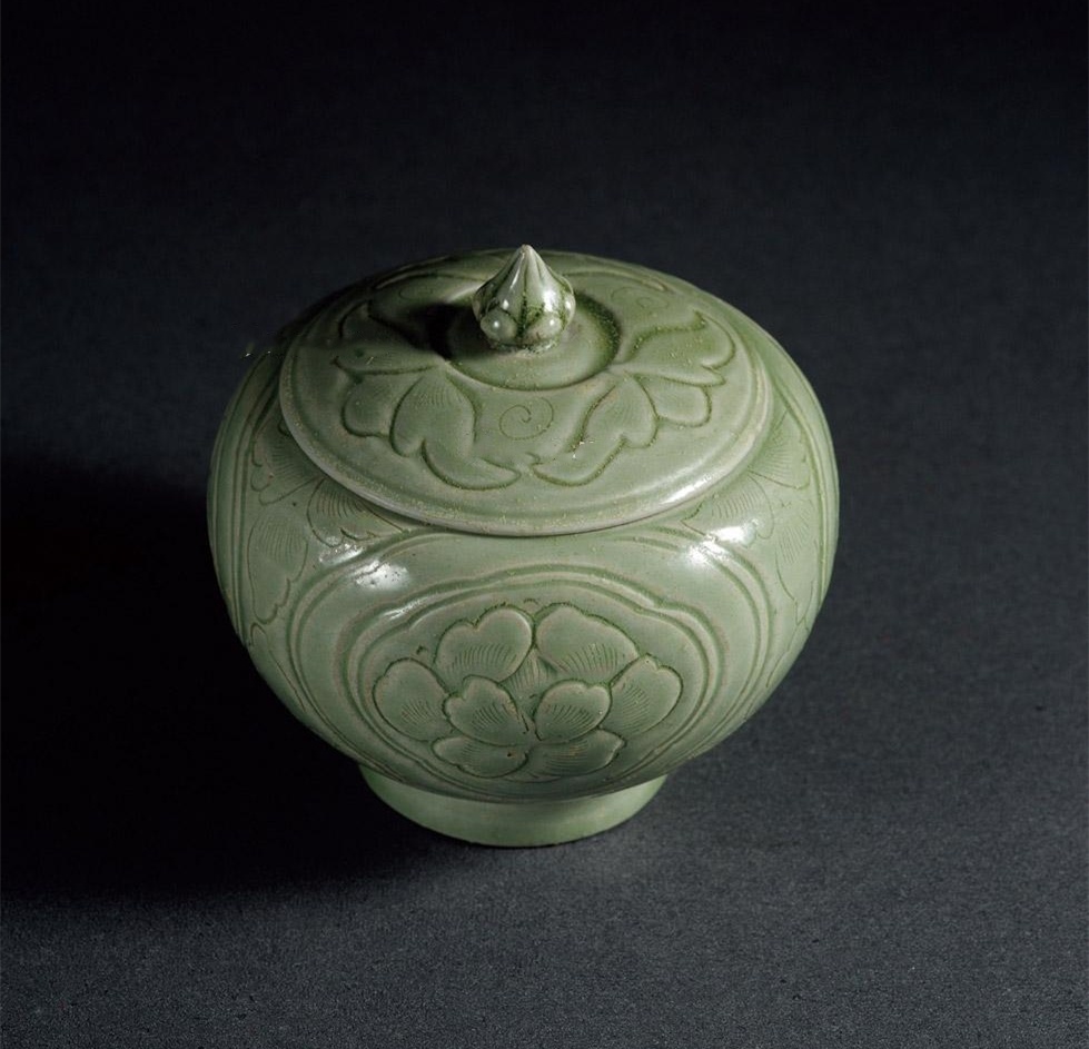 4:北宋十月款越窑刻花牡丹纹盖罐,尺寸:高12厘米,估价:RMB 400,000 ~ 500,000,成交价: RMB 2,760,000 ,成交时间: 2018-07-08 ,拍卖公司:西泠印社拍卖有限公司,拍卖专场:2018年春季拍卖会。
