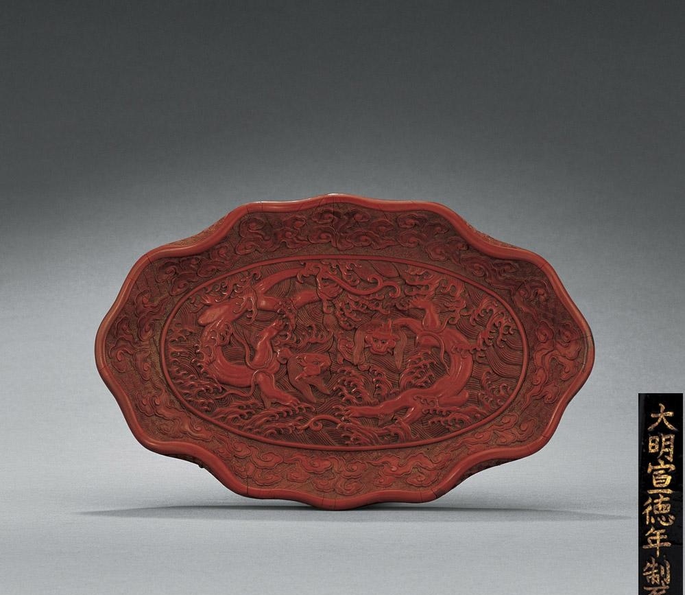 1:明宣德剔红双螭荷叶式盘,尺寸:宽24.5厘米,估价:HKD 1,500,000 ~ 2,000,000,成交价: HKD 5,024,000 ,成交时间: 2007-05-29 ,拍卖公司:佳士得香港有限公司,拍卖专场:2007春季艺术品拍卖会。