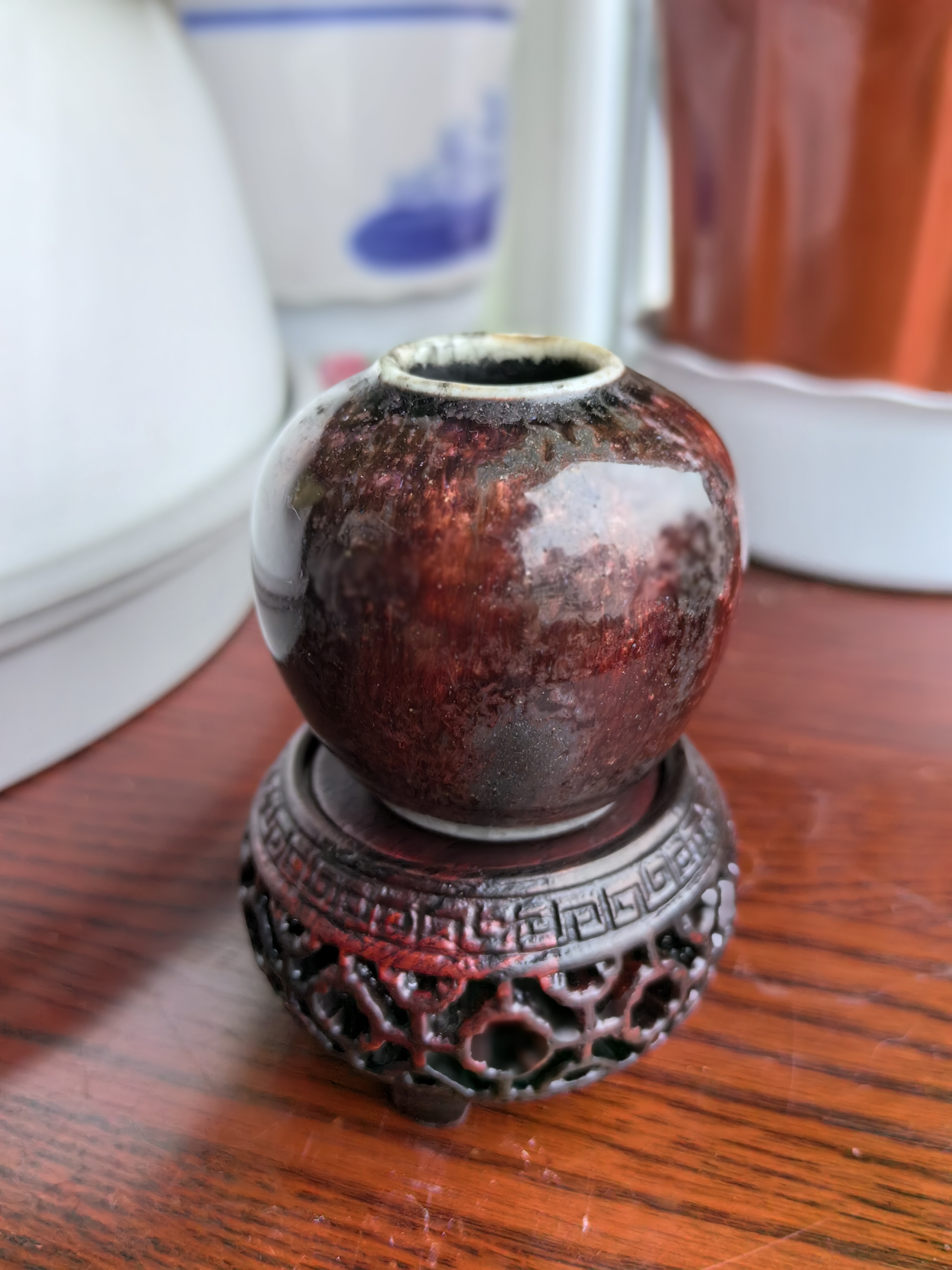 清中期郎红一粒珠水盂,发色深沉,器身自然开片,无磕无冲,灯草口。底部出窑的时候磨过,看最后两图。