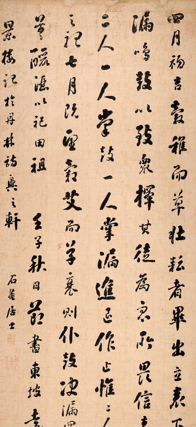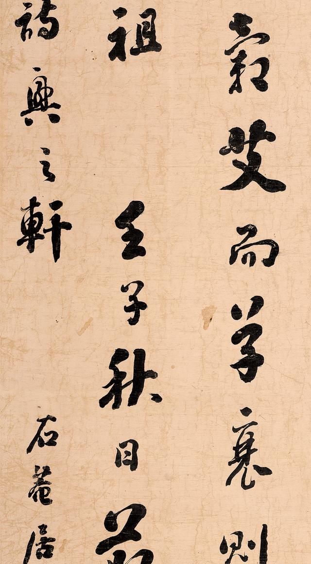 现藏于辽宁省博物馆的刘墉真迹《节书 • 远景楼记》为行书,纸本,纵165厘米,横56.1厘米。书写于乾隆五十七年,即1792年,刘墉时年74岁。当代书家朱以撒所说,刘墉书法的韵味“不是形之于纸面上的,而是沉于笔底的”,韵味在于品味。
