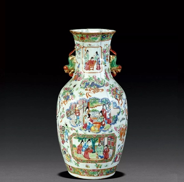 广彩开光人物狮耳瓶, 拍卖成交价格估计:RMB 3,200,000-3,200,000,最终成交价格:RMB 3,500,000, 拍卖专场:英国皇室贵族拍卖有限公司 2016新加坡中国古艺术品拍卖会, 拍卖成交时间:2016-11-20, 尺寸:高44cm。