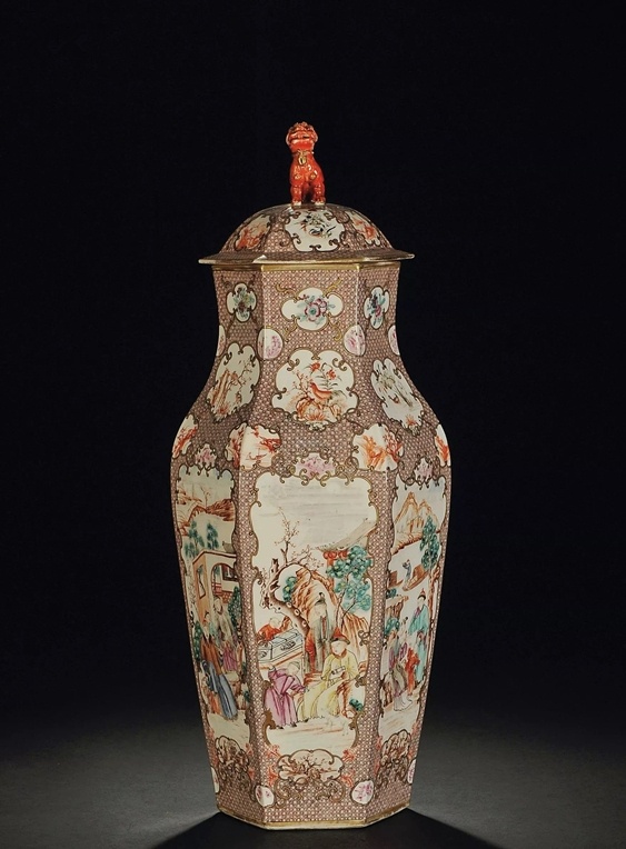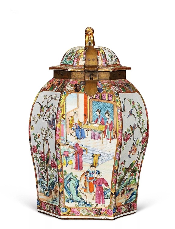 清嘉庆 广彩六方人物花鸟纹盖罐 , 拍卖成交价格估计:RMB 450,000-550,000,最终成交价格:RMB 483,000, 拍卖专场:广州华艺国际拍卖有限公司 2013年冬季拍卖会, 拍卖成交时间:2013-12-21, 尺寸:高62cm。