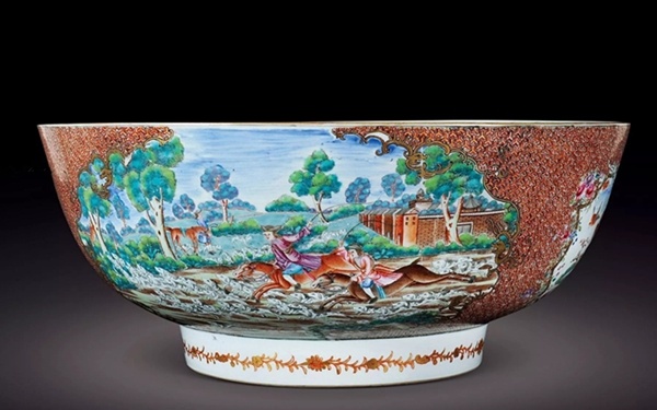 清乾隆 广彩狩猎图大碗, 拍卖成交价格估计:RMB 150,000-200,000,最终成交价格:RMB 201,140, 拍卖专场:广东省拍卖行有限公司 2018秋季艺术品拍卖会, 拍卖成交时间:2018-09-20, 尺寸:直径41cm。