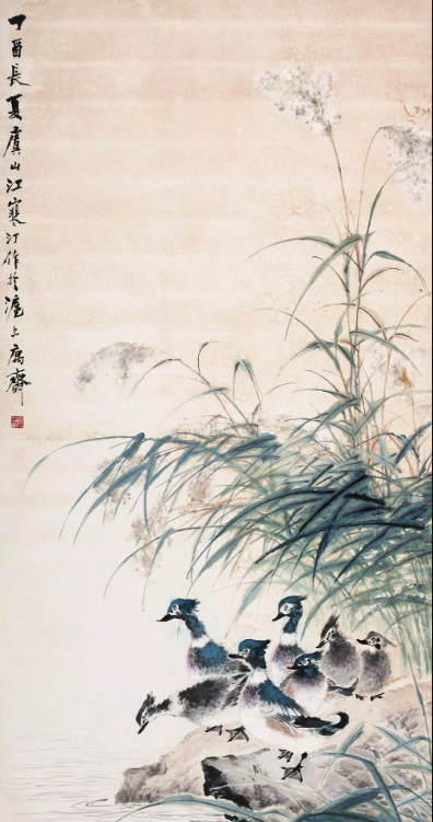 图1:江寒汀1957年作 秋塘野禽 立轴 设色纸本;成交价:RMB 2,016,000;尺寸:247×124厘米;拍卖公司:上海工美拍卖有限公司;成交时间:2010-11-04。