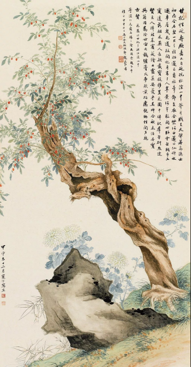 图3:江寒汀甲申(1944)年作 甘杞隐菊 立轴 设色纸本;成交价:RMB 1,736,000;尺寸:139×69厘米;拍卖公司:上海天衡拍卖有限公司;成交时间:2010-12-15。
