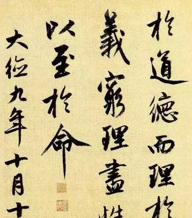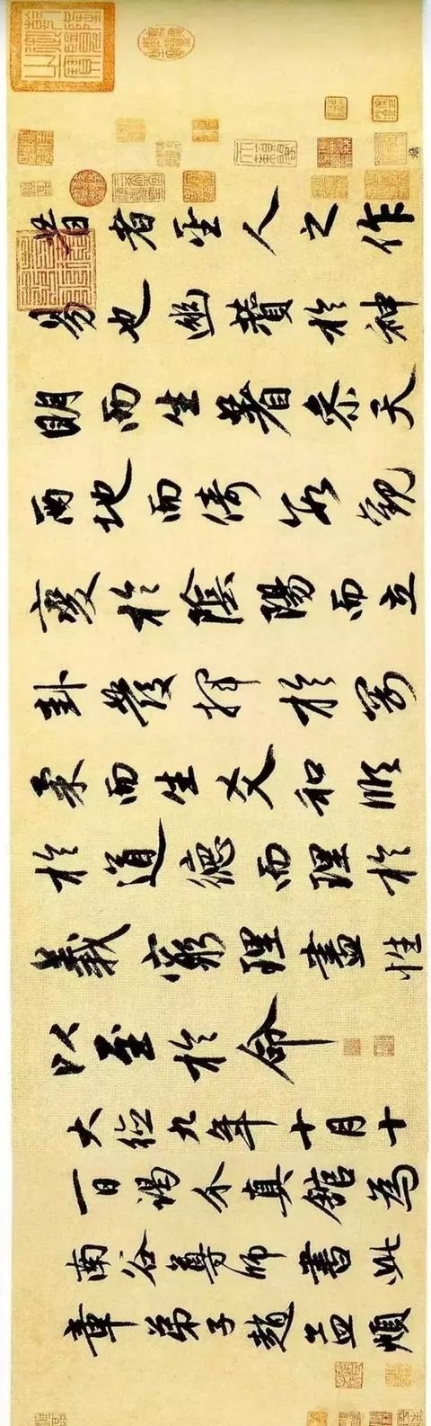 大德九年(1305年),赵孟頫52岁,为杜道坚真人书《周易系辞》。作品无拘无束,信笔书来,行中夹草,方圆并用,秀美遒劲,独俱风格。
