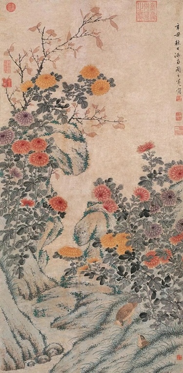 菊花鹌鹑 立轴 设色纸本, 拍卖成交价格估计:RMB 1,600,000-2,600,000,最终成交价格:RMB 3,300,000, 拍卖专场:中贸圣佳国际拍卖有限公司 2005春季艺术品拍卖会, 拍卖成交时间:2005-07-30, 尺寸:132×62.5cm。